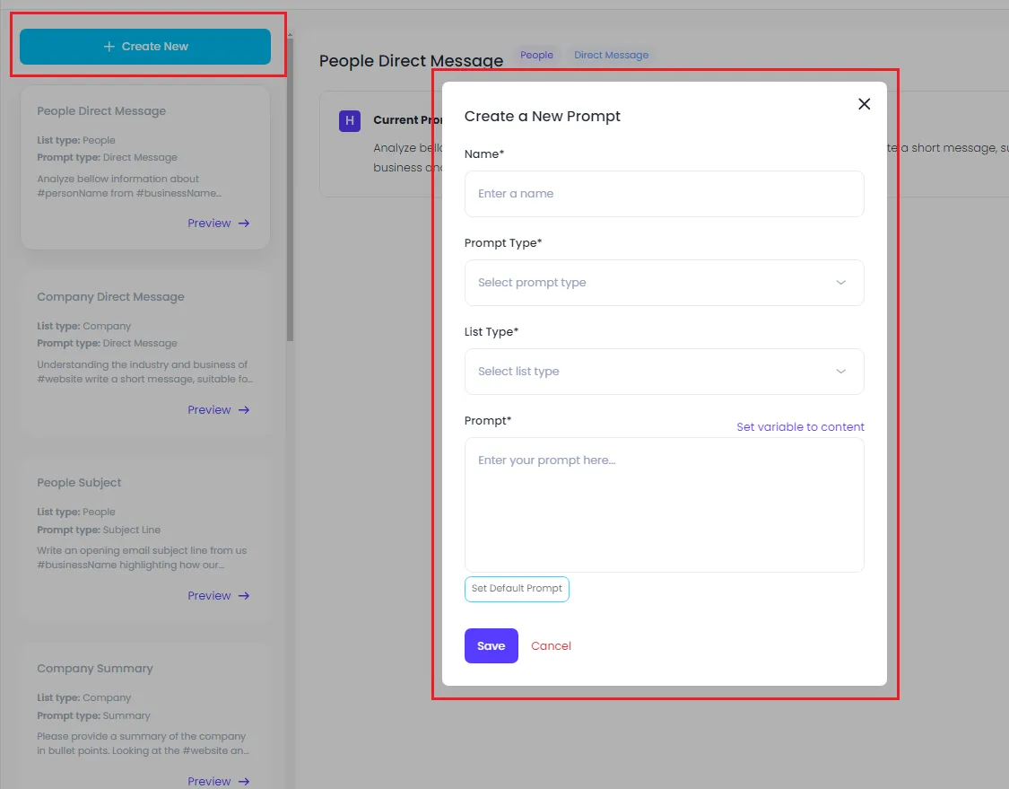 Click on "Create New Prompt": This will start the process of configuring a new prompt.