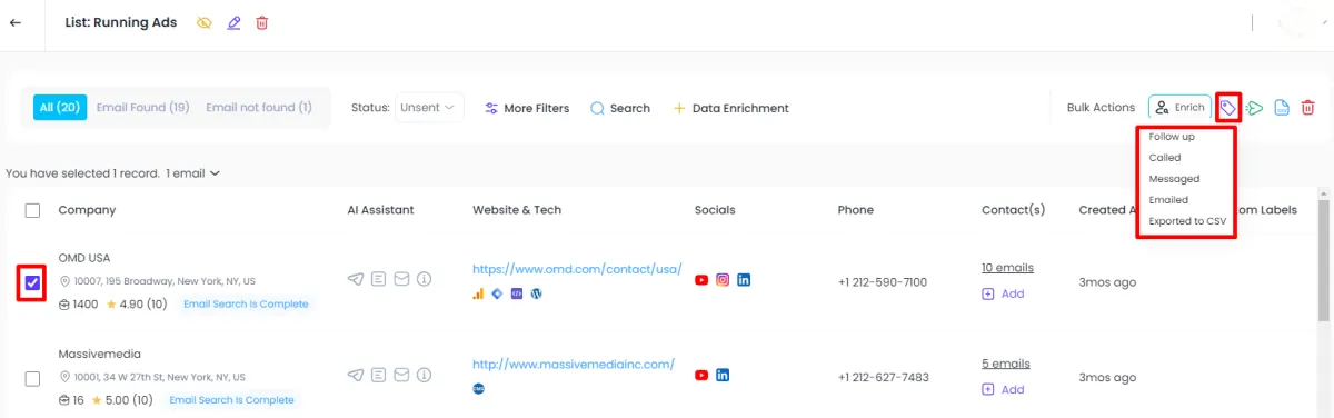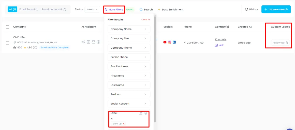 View the applied labels next to each lead and use them to filter and manage your interactions effectively.
