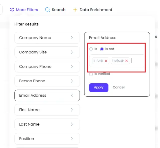 Example: Filter out generic email addresses such as "admin@", "info@", or "hello@."