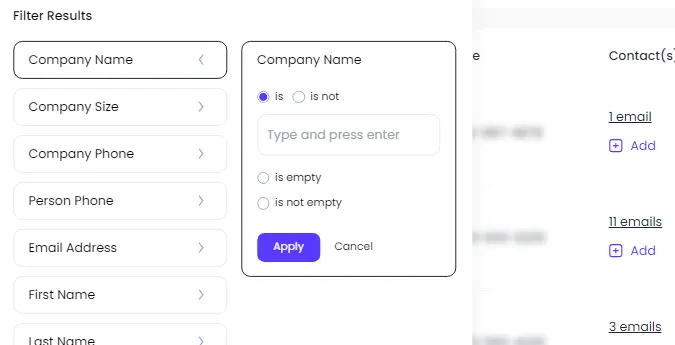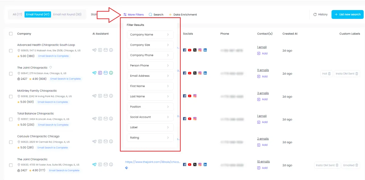 Use filters to narrow down results based on the presence or absence of phone numbers or email addresses.